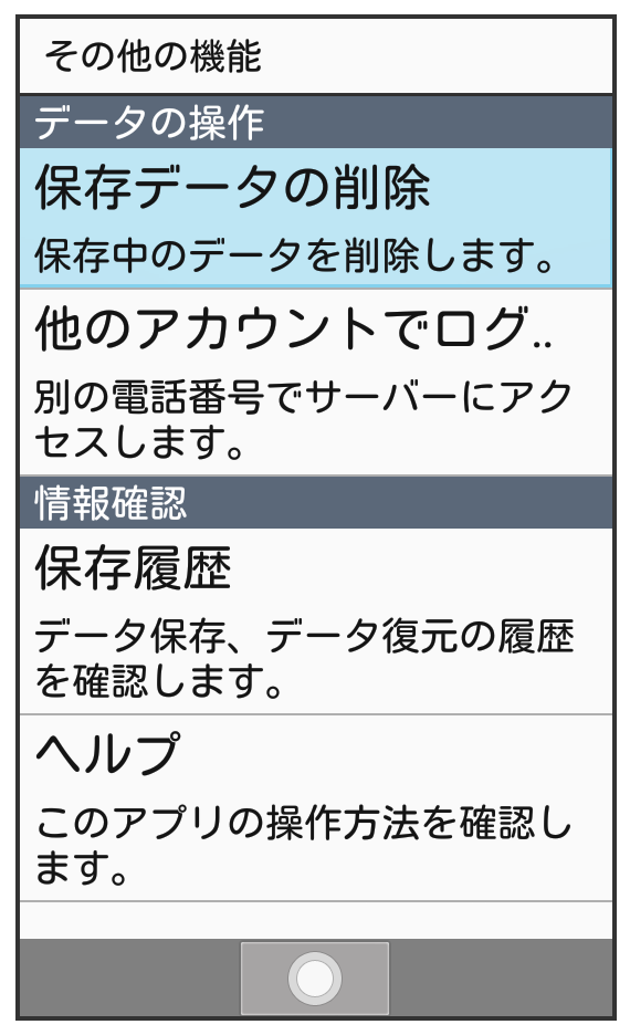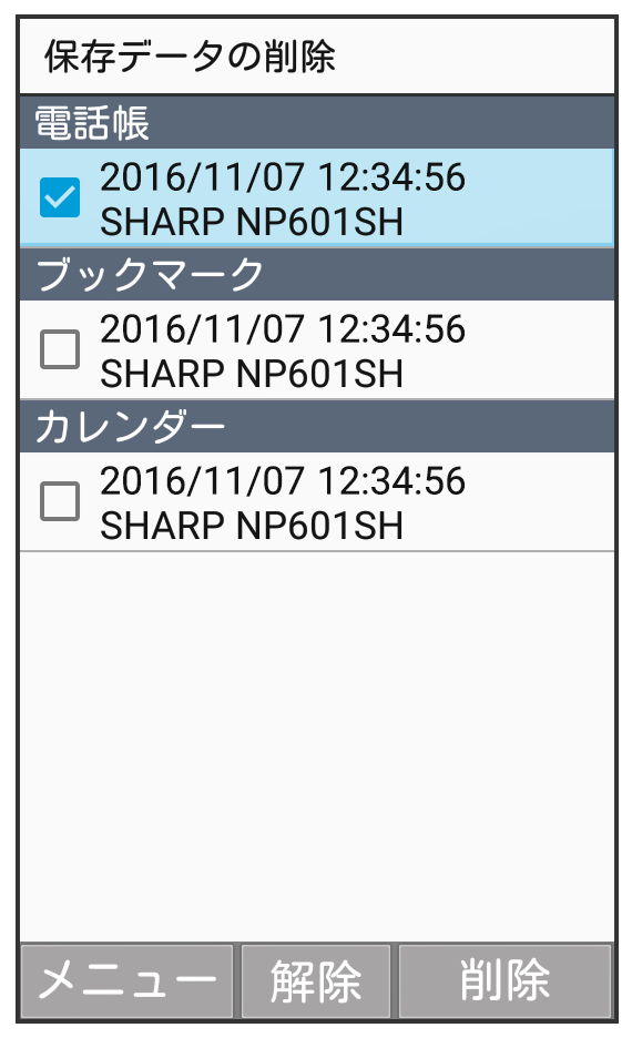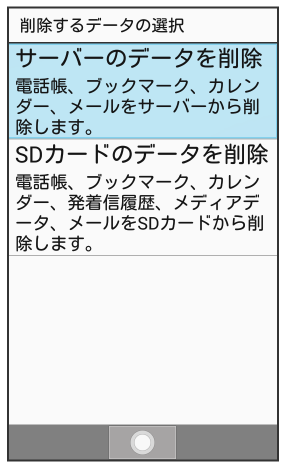 サーバー/SDカードなどに保存した電話帳データ/ブックマークデータ/カレンダーデータ/発着信履歴データ/画像データ/音楽データ/動画データ/メールデータを削除します。