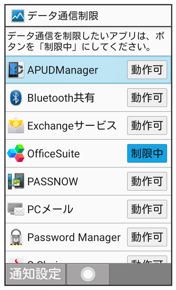 データ通信制限画面で制限中の機能を選択予期せぬモバイルデータ通信をする機能のインストール時に確認するかどうかを設定する