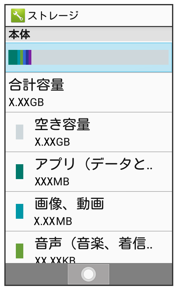 | 空き容量 | 内部ストレージやSDカードの空き容量を確認します。 |