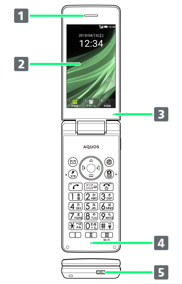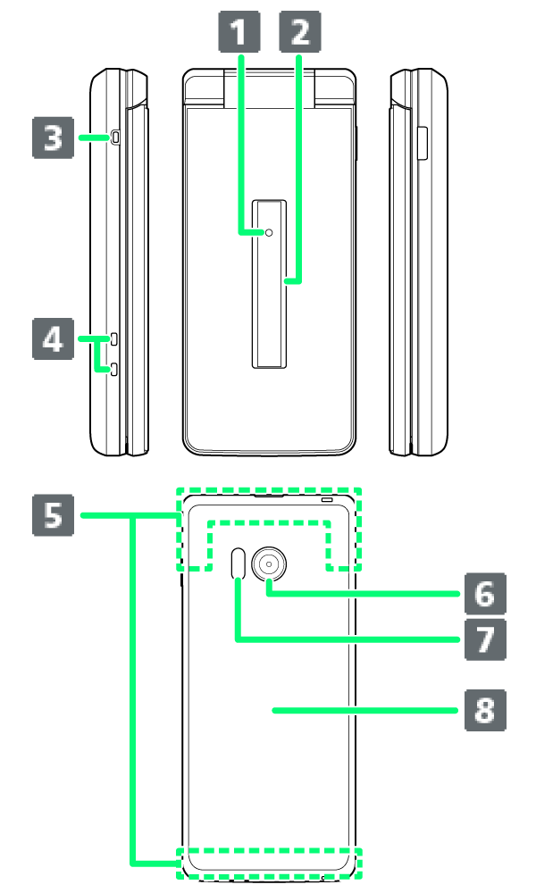| 受話口/スピーカー | 通話相手の声や音楽、動画、テレビなどの音声が聞こえます。 |