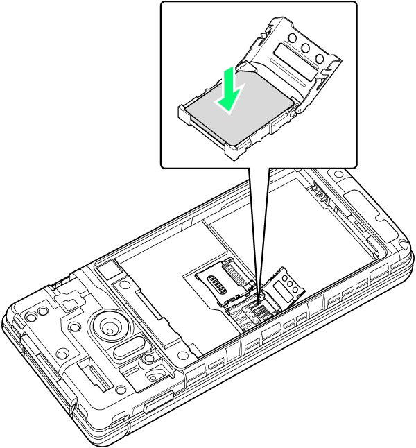 - SIMカードの向き(切り欠き部分/IC(金属)部分を下)に注意し、SIMカードをSIMカードスロットに置きます。