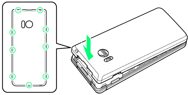 - 電池カバーを本体に合わせて置き、〇の位置をしっかりと押して、本体との間にすき間がないことを確認してください。