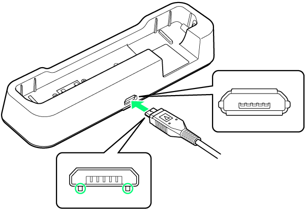 - microUSBプラグを誤った向きに差し込むと、卓上ホルダーの接続端子が破損することがあります。microUSBプラグの形状と向きをよく確かめて、突起(○部分)を下にして差し込んでください。