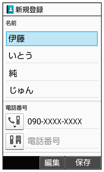 名前、電話番号、メールアドレス、グループを登録する方法を例に説明します。