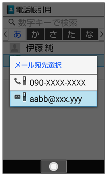 - 連絡先に電話番号/メールアドレスのどちらか1件だけ登録されているときは、メール宛先の選択画面は表示されません。