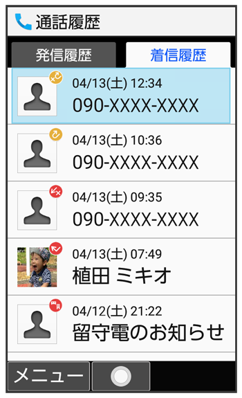 着信履歴一覧画面で留守番電話の伝言メッセージありの履歴を選択- 以降は、アナウンスに従って操作してください。