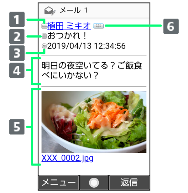 メール詳細画面で差出人/宛先/電話番号/メールアドレスを選択未受信の本文や添付ファイルを受信する