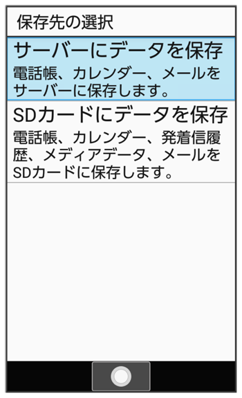 本体の電話帳データ/カレンダーデータ/発着信履歴データ/画像データ/音楽データ/動画データを、サーバー/SDカードなどに保存します。