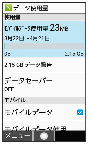 - 以降、使用中に上限に達したときは、モバイルデータ通信を無効にした案内が表示されます。このときは、画面に従って操作してください。