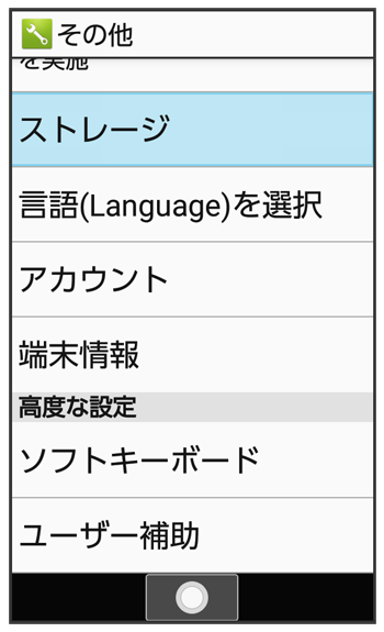 内部ストレージやSDカードのメモリ容量の確認や、SDカードのマウント/マウント解除、SDカード内のデータの消去などが行えます。設定できる項目は次のとおりです。