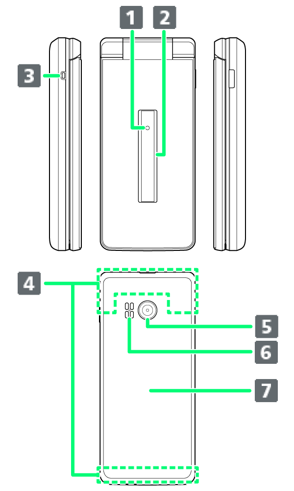 | 通信用内蔵アンテナ | 通話時、インターネット利用時などに使用します。感度に影響しますので、シールなどを貼ったり手で覆ったりしないでください。 |