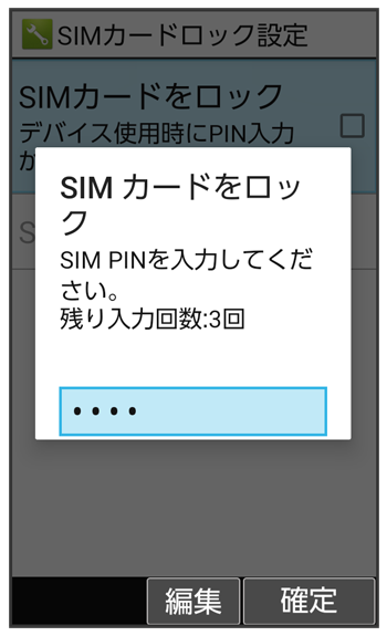SIMカードロック設定中に、SIMカードロック設定画面でPINコードを入力