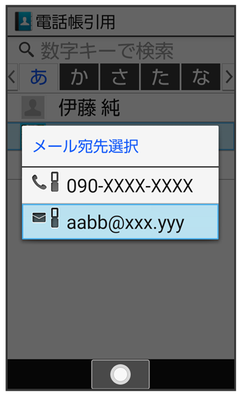 - 連絡先に電話番号/メールアドレスのどちらか1件だけ登録されているときは、メール宛先の選択画面は表示されません。