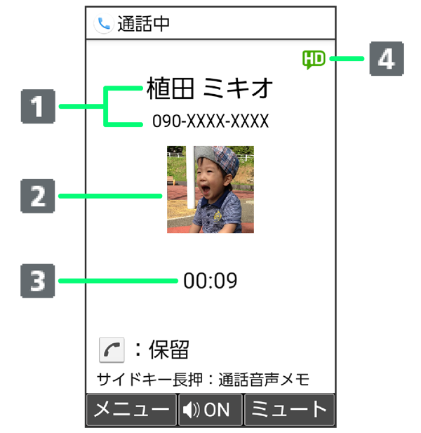 (メニュー)と操作します。 - 市販品のマイク付ステレオイヤホンやハンズフリー機器で通話中は、受話口/スピーカーから自分の声は聞こえません。