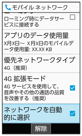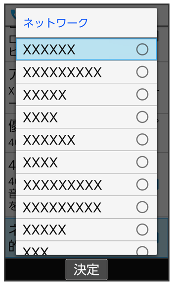 と操作すると、利用可能なすべてのネットワークを検索します。 - 自動的に適切な通信事業者に接続するように設定するときは、再度、(