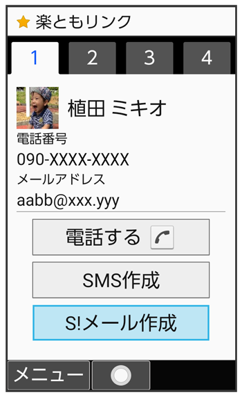 よく連絡する相手を楽ともリンクに登録すると、簡単にS!メールを送信することができます。