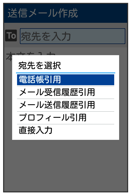- //を選択すると、電話帳/メール受信履歴/メール送信履歴から宛先を選択できます。