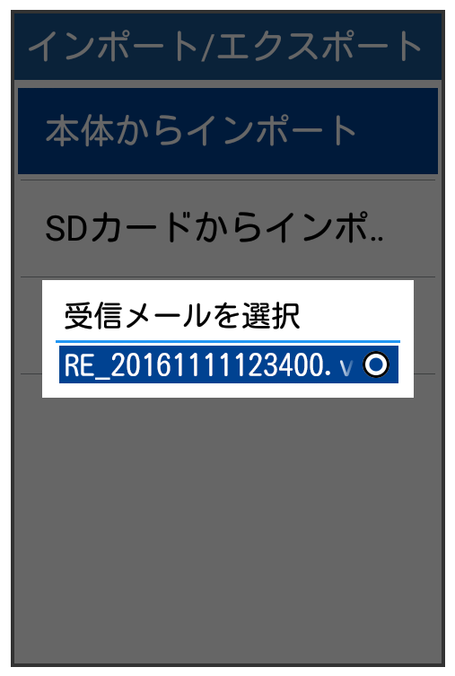 SDカードなどにエクスポートしたvMessage形式のメールデータを、本体にインポートします。