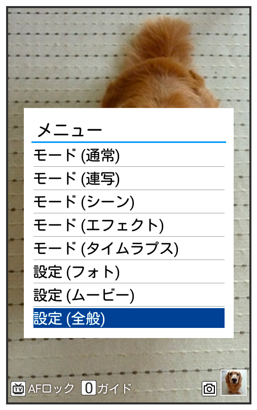 | 初期設定に戻す | フォト/ムービー/全般のすべての設定メニューを初期値に戻します。 |