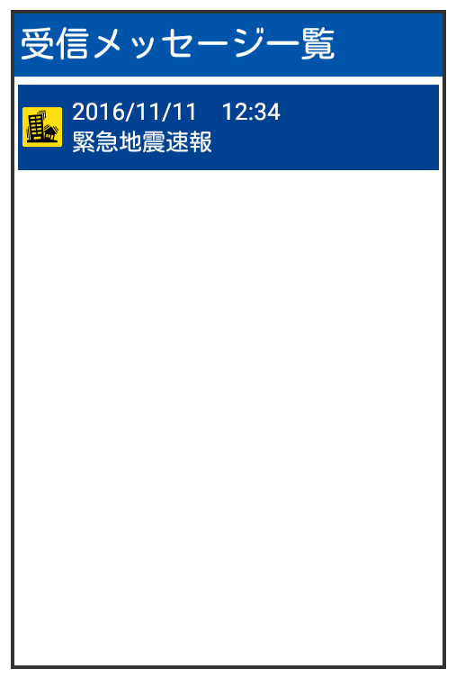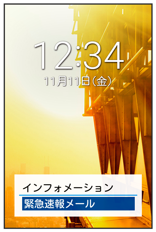 緊急速報メールの受信画面が表示され、緊急地震速報用警告音/災害・避難情報、津波警報用警告音、バイブレータおよび着信LEDでお知らせします。
