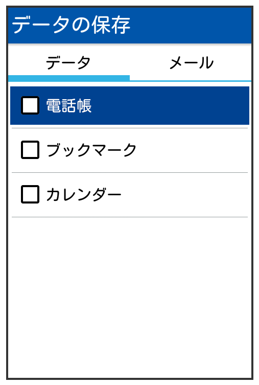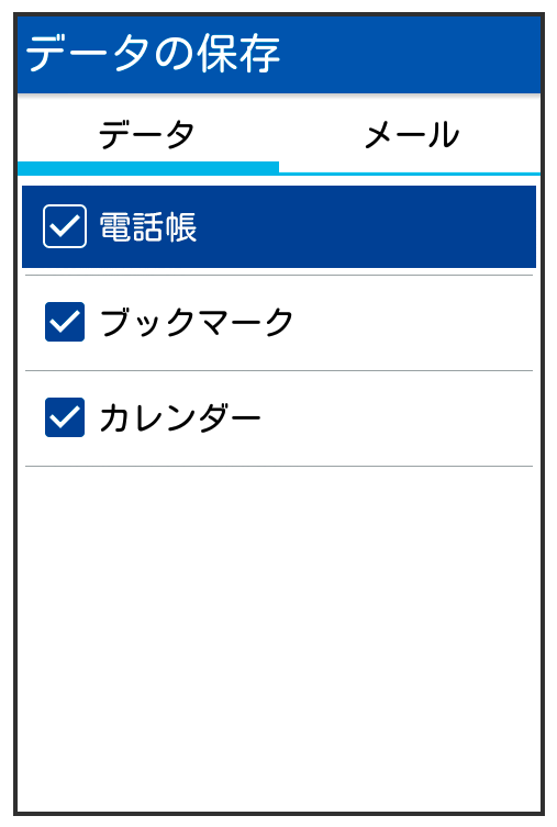 本体の電話帳データ/お気に入りデータ/カレンダーデータ/発着信履歴データ/画像データ/音楽データ/動画データを、サーバー/SDカードなどに保存します。