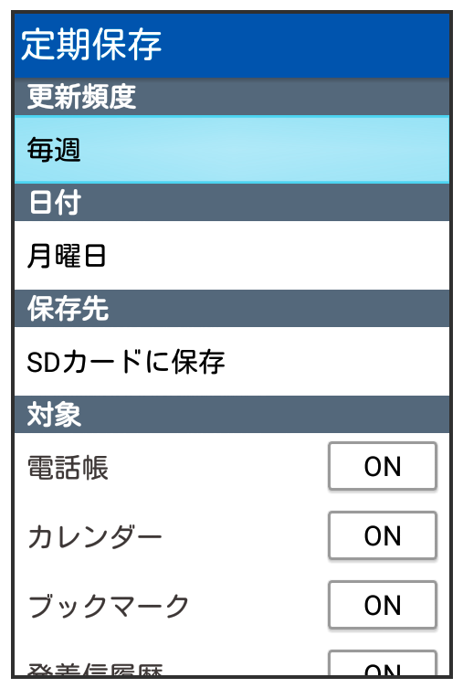 本体の電話帳データ/お気に入りデータ/カレンダーデータ/発着信履歴データ/画像データ/音楽データ/動画データを、サーバー/SDカードなどに定期的に自動で保存します。