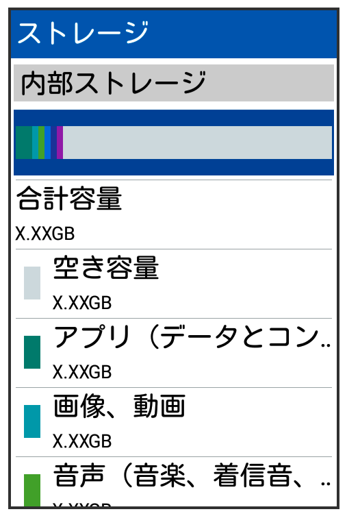 | 合計容量 | 本体メモリやSDカードの合計容量を確認します。 |