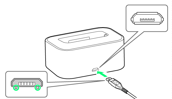 - microUSBプラグを誤った向きに差し込むと、卓上ホルダーの接続端子が破損することがあります。microUSBプラグの形状と向きをよく確かめて、突起(○部分)を下にして差し込んでください。