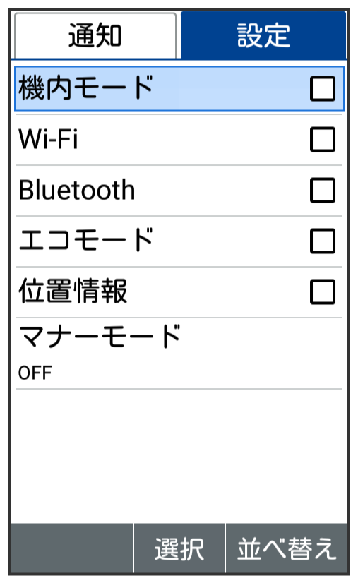 設定パネルを利用すると、機内モードやWi-Fi、Bluetooth®などのON/OFF、マナーモードの設定などができます。