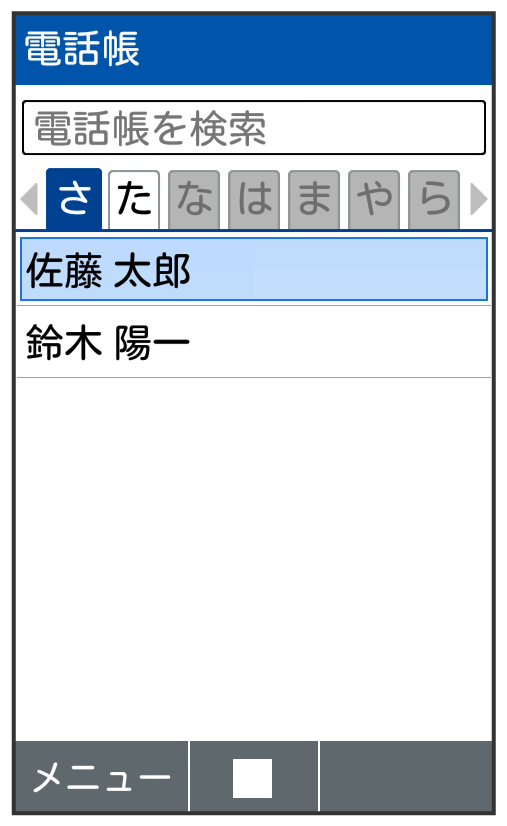(詳細)を押すと、その他の項目も表示します。 - 電話帳画面で検索ワードを入力すると、電話帳の絞り込み検索ができます。名前(よみがな)/電話番号/Eメールアドレスなどの項目が検索対象となります。