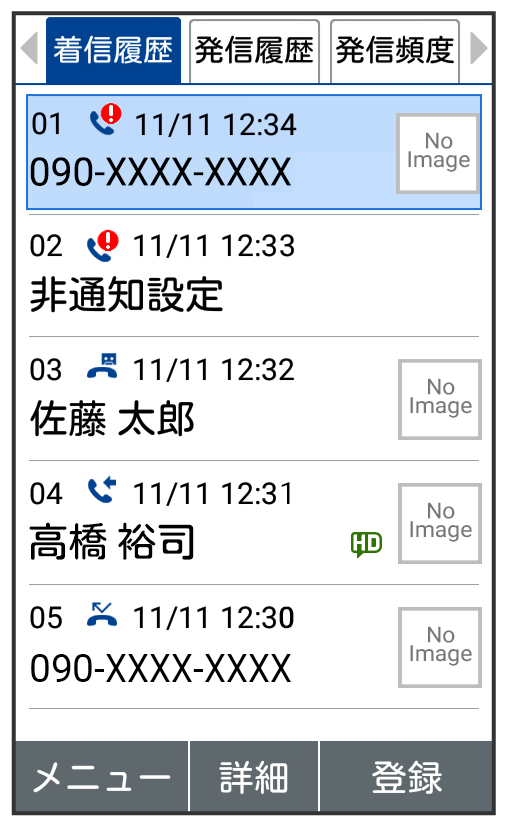 着信履歴/発信履歴/発信頻度一覧画面のマークの見かた