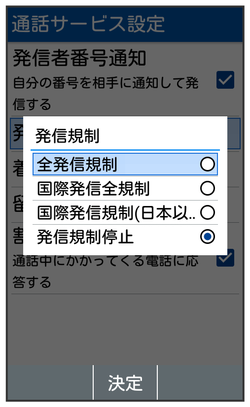 | 国際発信規制(日本以外) | 滞在国と日本以外への国際電話の発信を規制します。 |