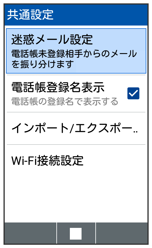 | Wi-Fi接続設定 | Wi-Fi接続でS!メールを送受信するための設定を行います。 |