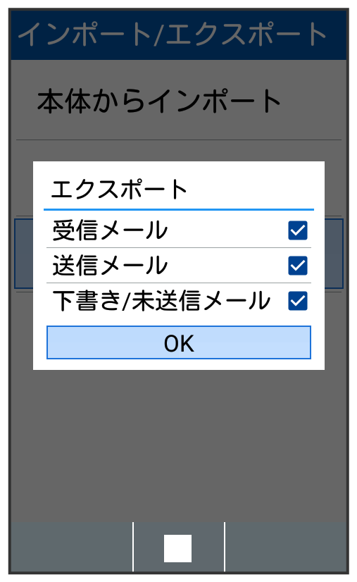 - 本体に保存されている受信メールデータ/送信メールデータ/下書き/未送信メールデータごとにエクスポートします。メールデータを1件ずつ選択して保存することはできません。