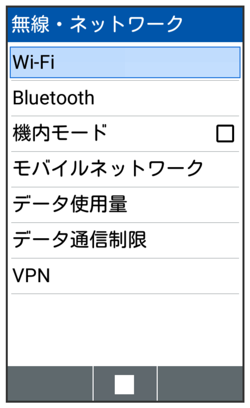 | Wi-Fi | Wi-Fi接続の設定をします。 詳しくは、「Wi-Fiで接続する」を参照してください。 |
