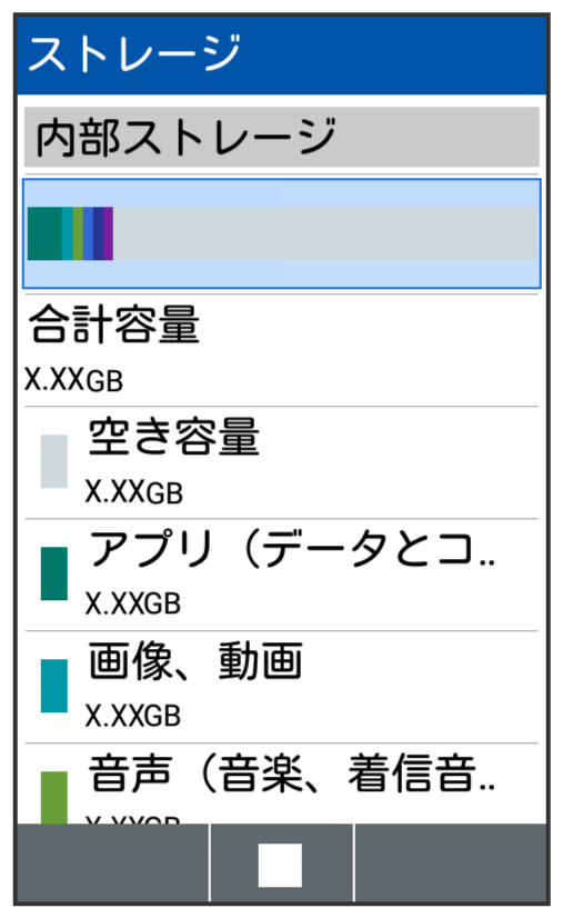 | 合計容量 | 本体メモリやSDカードの合計容量を確認します。 |