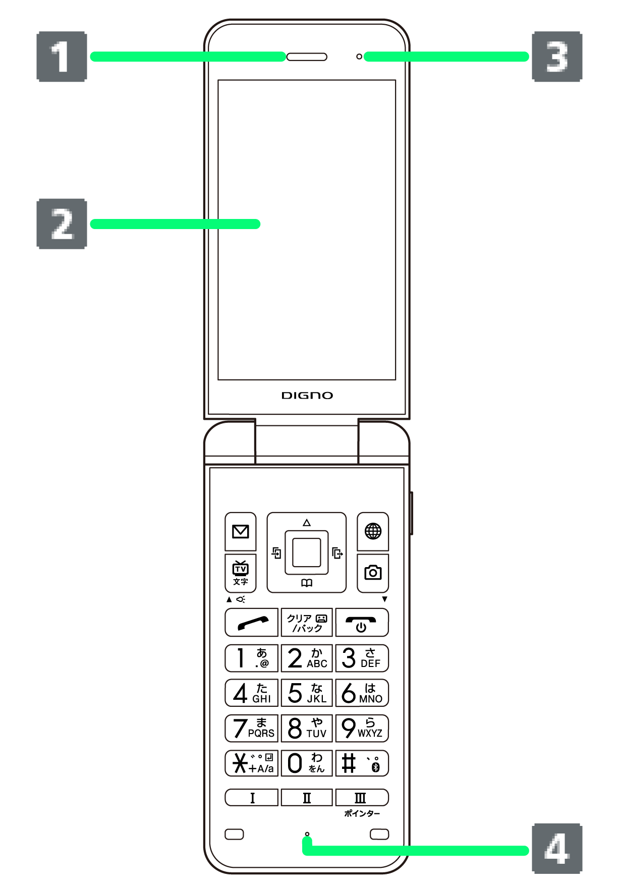| 受話口/スピーカー | 通話相手の声や音楽、動画、ワンセグなどの音声が聞こえます。 |