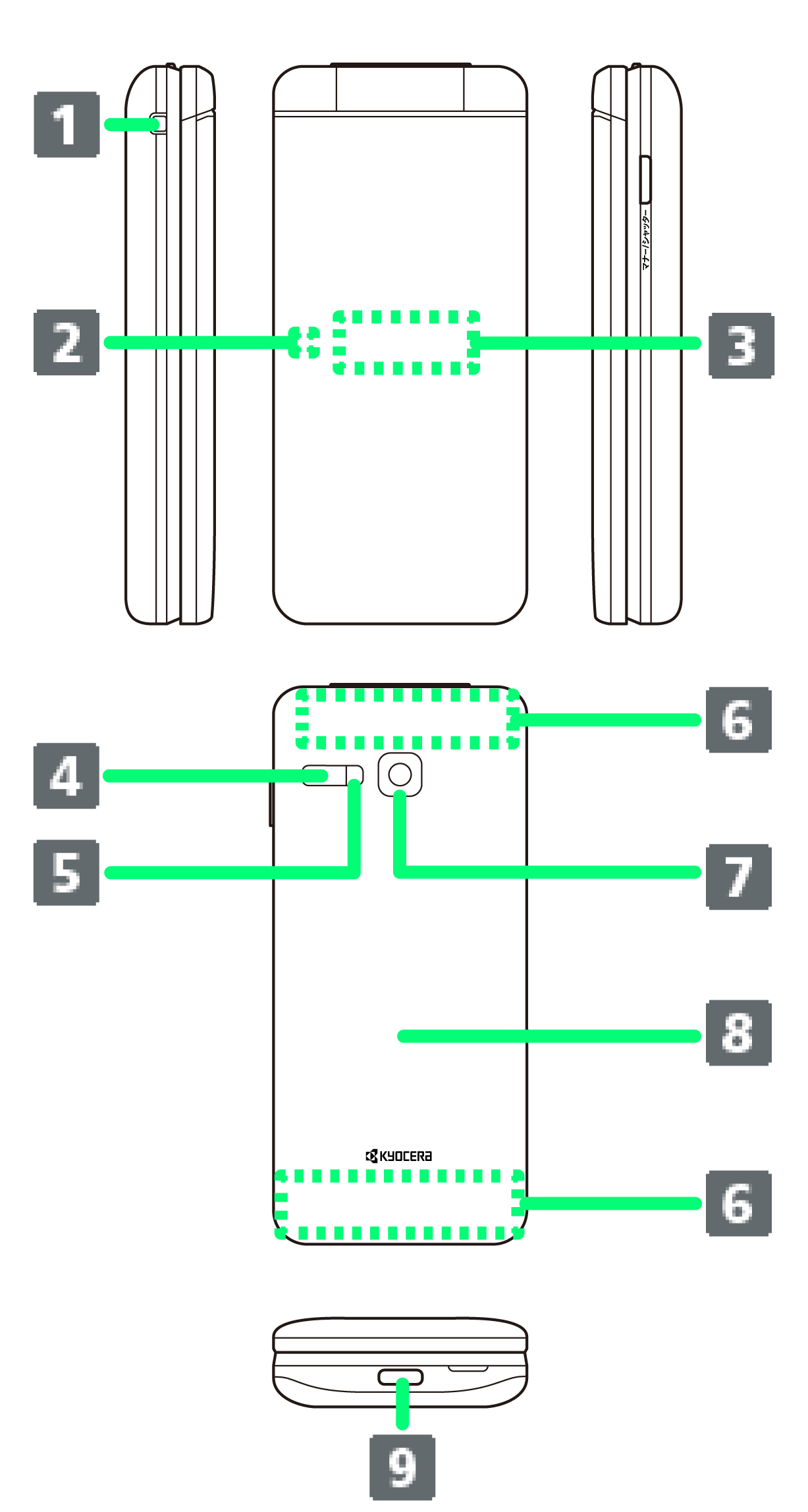 | 電池カバー | USIMカードやSDカード、電池パックの取り付け/取り外し時に取り外します。 |