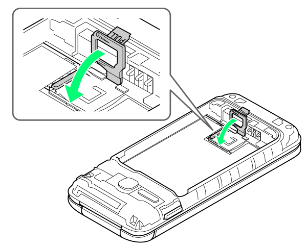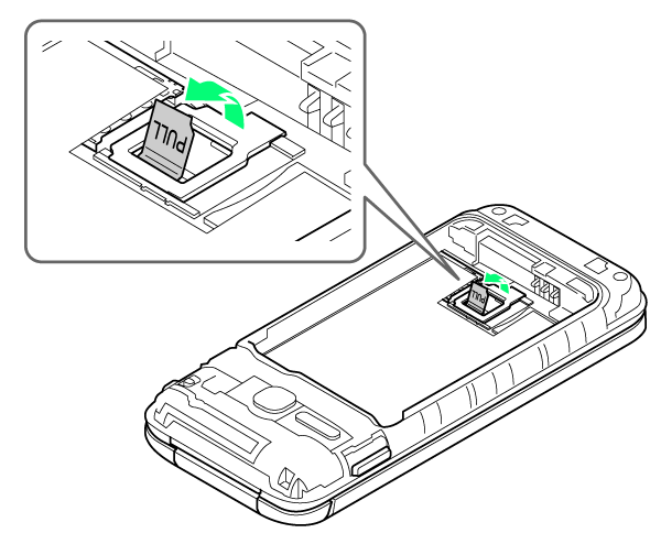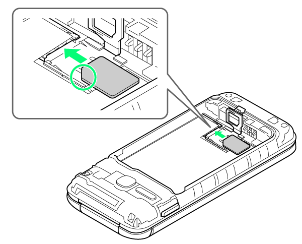 USIMカードを矢印の方向にスライドさせ、USIMカードスロットにカチッと音がするまで押し込む