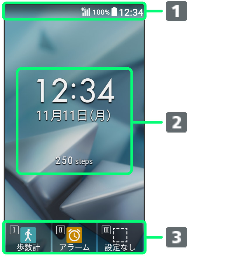 待受画面は次のようなしくみになっています。待受画面の設定で、ウィジェットやアプリを貼り付けることもできます。