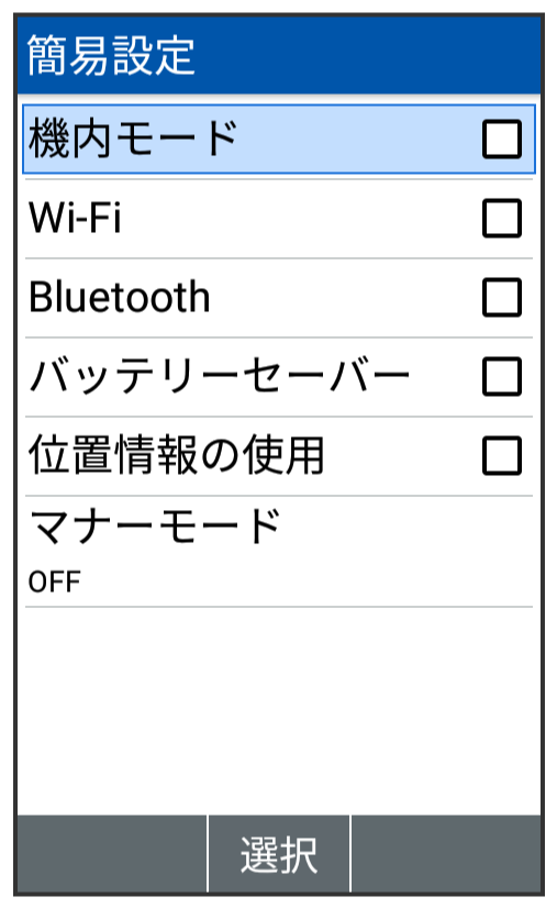 簡易設定パネルを利用すると、機内モードやWi-Fi、Bluetooth®などのON/OFF、マナーモードの設定などができます。