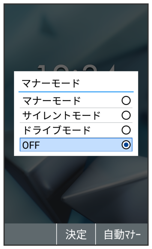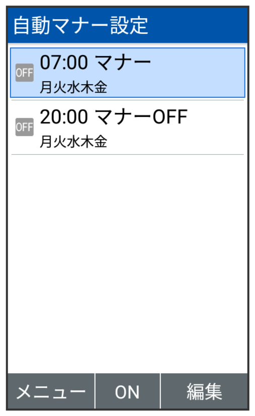 自動マナー設定画面で設定時刻を選択- に設定すると、設定時刻になるとマナーモードが解除になります。
