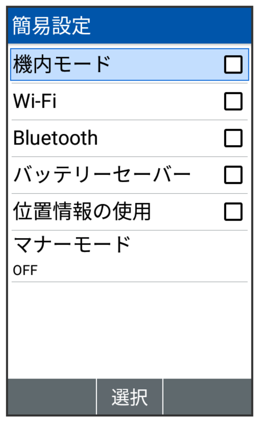 また、を設定したあとにWi-Fi機能やBluetooth®機能を有効にすると、機内モード設定中でもWi-Fi機能やBluetooth®通信を行うことができます。通信が許可されている場所であるか確認のうえ、操作してください。