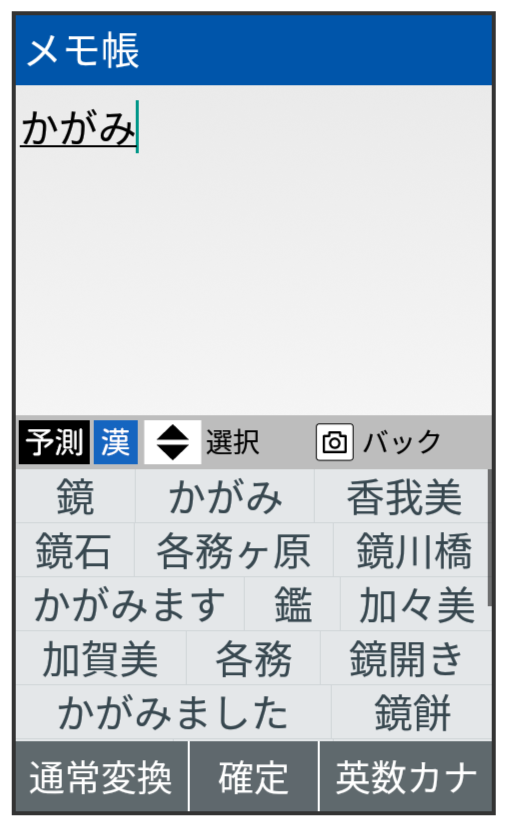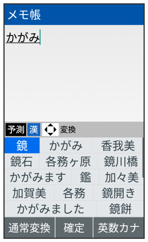 「ひらがな漢字」の文字種で入力した「かがみ」を「鏡」に変換する方法を例に説明します。