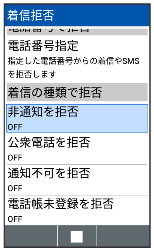 非通知での着信、公衆電話や通知不可電話からの着信を拒否することができます。
