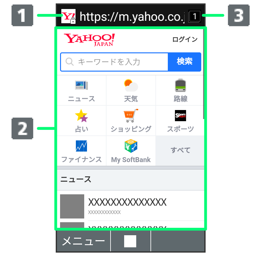 (メニュー)と操作してもWeb検索・URL入力ができます。 - Web検索・URL入力について詳しくは、「Web検索やURL入力からアクセスする」を参照してください。