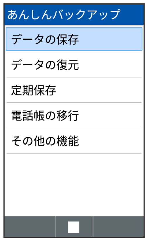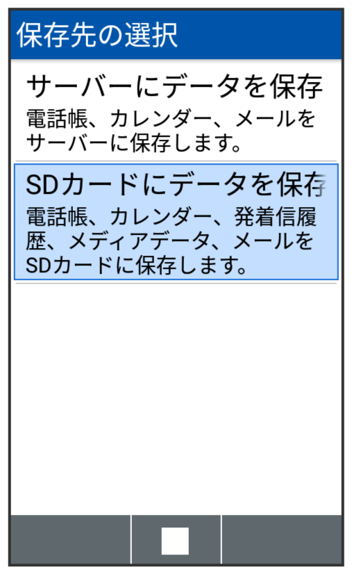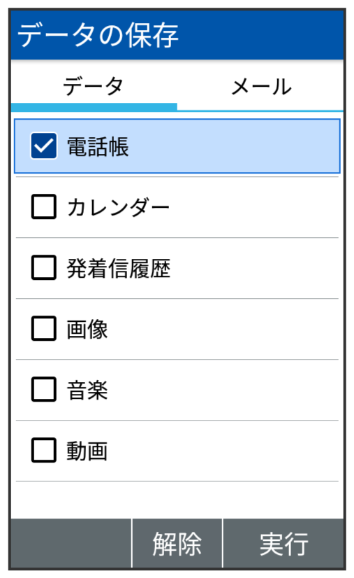 本体の電話帳データ/カレンダーデータ/発着信履歴データ/画像データ/音楽データ/動画データを、サーバー/SDカードなどに保存します。