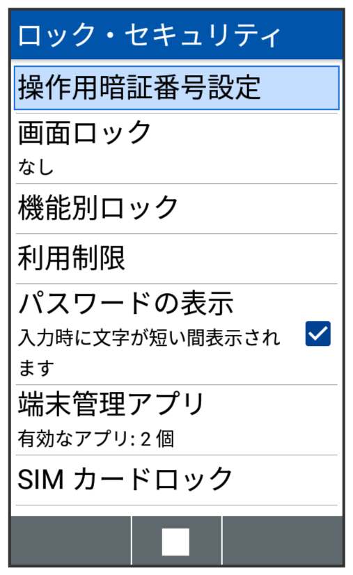 画面ロックや暗証番号など、セキュリティに関する機能を設定できます。設定できる項目は次のとおりです。