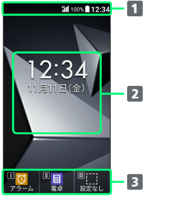 待受画面は次のようなしくみになっています。待受画面の設定で、ウィジェットやアプリを貼り付けることもできます。