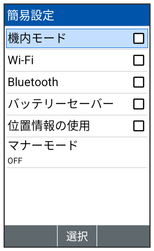 簡易設定パネルを利用すると、機内モードやWi-Fi、Bluetooth®などのON/OFF、マナーモードの設定などができます。